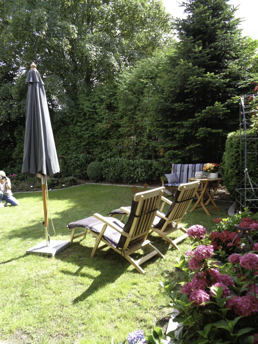 Garten mit Strandkorb, Liegen, Bank, sowie Marktschirm